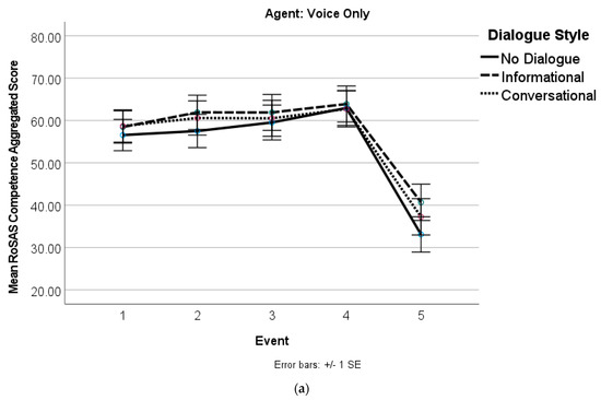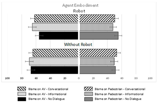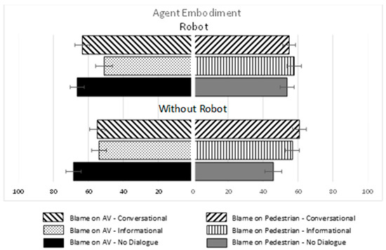Anthropomorphism using robot agents has been shown to increase trust, including within the context of AVs. Ref. [40] demonstrated that anthropomorphising an AV IA (or AVIA) can increase perceptions of competence. Participants experienced a simulation of a Level 5 AV under three informational assistant conditions: voice-only agent, conversational voice-only agent, and conversational with robot embodiment. The latter condition involved a Nao humanoid robot used commonly in human-robot interaction and especially in social robotics studies [41]. Ref. [40] defined conversational style as involving phrases that replicate more natural interaction than an informative style (i.e., the voice-only agent condition). For example, in the informative style condition, participants heard ‘tunnel ahead’, whereas in the conversational style condition, participants heard ‘we are entering a tunnel’. After eight events, the conversational robotic agent was rated significantly more competent than the other two conditions. It was also rated significantly higher in terms of warmth (an attitude towards the robot). However, these findings were observed in situations with no negative outcomes, where the AV and other road agents were performing optimally. Thus, they cannot be generalised to situations involving unexpected and/or unavoidable incidents resulting in an accident.