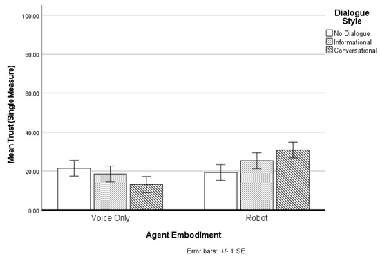 - HTrust-3–Agent*Dialogue Style interaction: Trust will be higher in the robot-embodied conversational condition than in the no-robot conversational condition. The difference will be reduced with informational speech. There will be no difference between agents within the no-speech dialogue style conditions, and overall, trust will be lowest in these conditions.