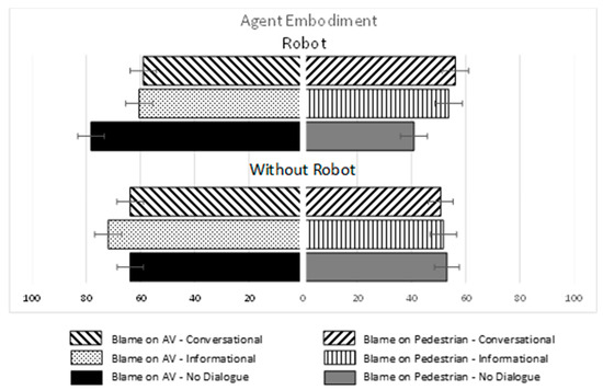 The agent (robot or no robot) was regularly communicating an intention to try and overtake the bus (when safe to do so), and this could have been perceived as risky even prior to the critical event (e.g., [informational] vehicle is driving behind a bus on a country lane, looking for opportunities to overtake; [conversational] we are driving behind a bus on a country lane, I am looking for opportunities to overtake). This may have impacted trust and blame ratings after the accident scenario (see also [30]) and was quite different to the speech materials used in past studies [40,42,43]. Numerous other studies have shown that a higher perception of risk in a robot can negatively impact trust [61,62], use [63], and satisfaction and intention to reengage [64]. This is also the case in the event of robots being perceived to perform poorly [65].
