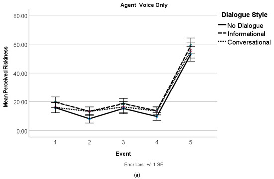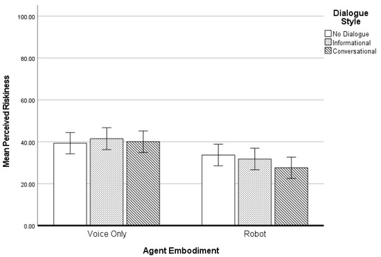 Mean ratings of perceived riskiness across agent embodiment and dialogue conditions. Error bars are ±SE.