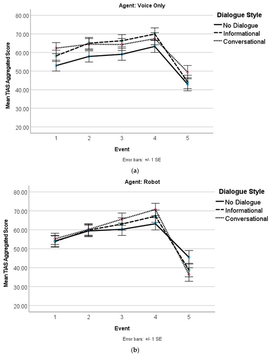 TiAS: Answers to questions 1–5 were reverse-coded prior to all item scores being averaged. TIAS item reliability was very high (α = 0.91). Compared to the single-item trust question, average TiAS scores are higher (Figure 3). However, there were non-significant main effects of agent embodiment, F(1,290) = 0.96, p = 0.33, dialogue style, F(2,290) = 1.74, p = 0.18, and a non-significant interaction, F(2,290) = 1.81, p = 0.17.