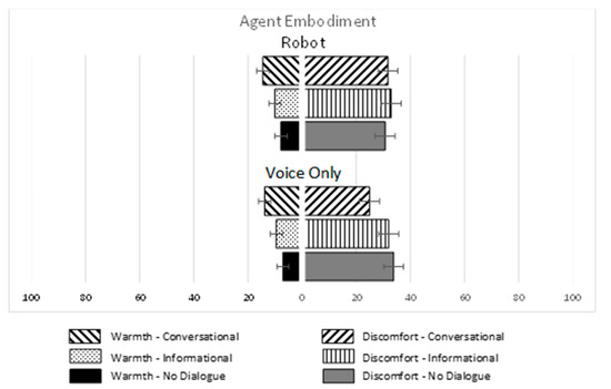Perceived Risk: Mean risk ratings were largely <40/100 and lowest in the robot agent conversational dialogue style condition (Figure 8). There was a significant main effect of agent embodiment, F(1,193) = 4.87, p = 0.028, f = 0.16, with lower risk in the physical embodiment than in non-physical embodiment agent conditions. There was a non-significant main effect of dialogue style, F(2,193) = 0.19, p = 0.83, and non-significant interaction, F(2,193) = 0.22, p = 0.80.