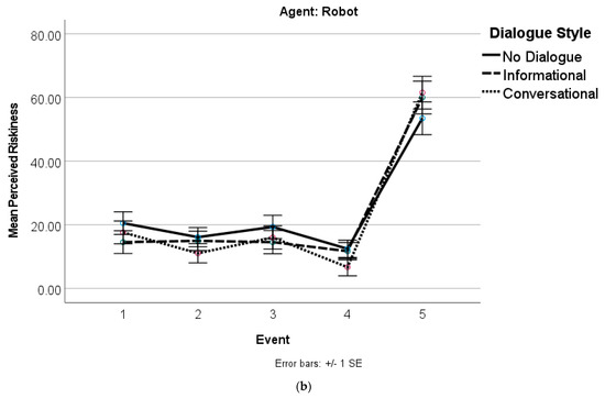 - HBlame-3–Agent*Dialogue Style interaction: As in HTrust-3, though with blame lower rather than higher in the robot agent embodied conditions, markedly so between the conversational dialogue style conditions and also between the informational dialogue style conditions with the highest blame in the no-speech conditions that will not differ between agent types.