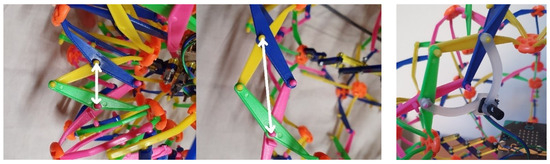 - Shape state: The shape state of the Hoberman sphere is described by its diameter. This can be described by measuring the angle between the rigid links that constitute any of the SLEs of the Hoberman sphere. We used a single-turn potentiometer to measure this angle. The mechanical assembly (see Figure 3) consists of two rigid elements attached to adjacent hinge-points and forming a SLE linked together by the potentiometer as the hinge axis.
