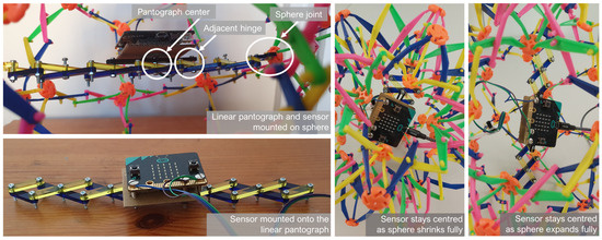 The potentiometer used to detect the shape state can be attached to any of the SLEs, and the change in shape state then becomes trivial to detect. The mounting of the tri-axis accelerometer/magnetometer presents another interesting design challenge. The sensor chip is integrated onto the micro:bit board, and thus the challenge is to mount the micro:bit board. Once again, while an external optical tracking option is technologically feasible, we sought a “self-contained” solution. The best position for the sensor to sense rotation-based manipulation is at the centre of the Hoberman sphere. Thus, the challenge was how to mount the sensor that remained at the centre of the sphere irrespective of the shape state changes the sphere is subjected to. In an early prototype, we used a pair of orthogonally arranged telescoping rods and placed the sensor at the intersection of the two, which also coincided with the centre of the Hoberman sphere. However, the force needed to manually actuate the telescoping rods is a lot greater than the force needed to manipulate the Hoberman sphere itself. We eventually selected a design that relies on a pantograph structure consisting of linear SLEs (see Figure 4). The linear SLEs were designed such that their controllable parameter (length) corresponds linearly to the controllable parameter (diameter) of the Hoberman sphere. We then attached the pantograph structure to a pair of diametrically opposite four-way link joints of the Hoberman sphere. This allowed the change in diameter of the Hoberman sphere to be reflected in the shape state of the pantograph structure. A critical design requirement is that the pantograph structure should have an odd number of hinge joints. If there are an odd number (2n + 1) of hinge joints, irrespective of the shape state, the mid-point of the structure coincides with the (n + 1)th hinge joint. A sensor attached to this hinge joint will always stay at the centre of the Hoberman sphere. A single sliding link running to adjacent hinge joints of the pantograph ensures that the rotational DoF of the micro:bit is fully constrained and tightly coupled to the sphere DoFs.