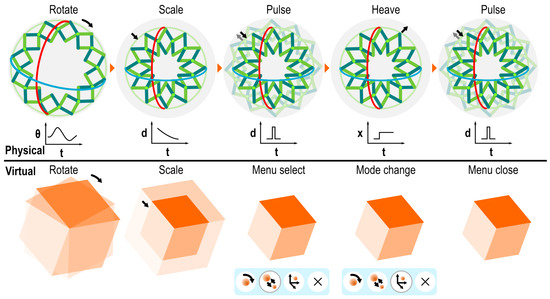 HoberUI device inputs: Physical to virtual mapping for user inputs (from left to right): virtual object is rotated by rotating the device, scaled by shrinking (or expanding) device, hidden menu activated by pulse input, menu options iterated by heave input, menu closed with last iterated option chosen through another pulse input.