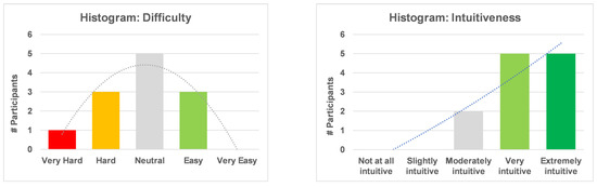 The responses to the Likert scale questions of ease of use and intuitiveness revealed interesting results. Nearly half the participants indicated neutral preference for the ease of use, finding it neither difficult nor easy to use. Figure 7 shows a near-normal distribution for the responses. On the other hand, the participants were more positive about their interpretation of its intuitiveness. There is a strong skew towards responses that indicated high levels of intuitiveness.
