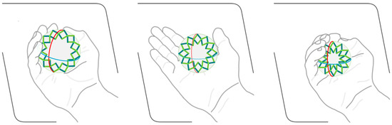 Kinematic structures have also been explored in the context of Human–Computer Interaction (HCI). This has been particularly relevant to the goal of creating reconfigurable devices such as modular tangible user interfaces (TUIs) and shape-changing interfaces (SCIs). Notably, we have seen applications of kinematic structures within a pneumatic structure for creating modular furniture [5], self-expandable wearable fabrics [6,7] and for creating tabletop tangibles using linear scissor-based actuated mechanisms to increase their height on demand [8]. An entire class of systems have been developed based on explorations of kirigami [9,10,11,12] and metamaterials [13,14,15,16].