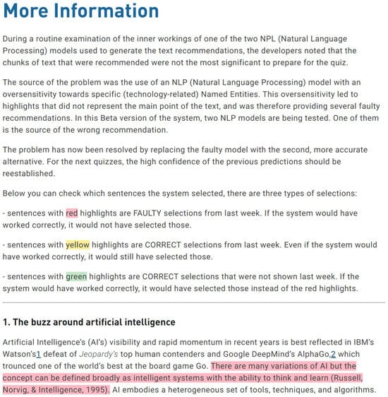 After the faulty recommendation, participants in the FwE group received a notification that a malfunction occurred in one of the NLP models used to generate the recommendations and that the issue had been solved for the upcoming quizzes. Furthermore, participants in this group had the chance to access a more detailed ‘local explanation’ (i.e., only concerning the reasons for the malfunction []) by clicking a ‘More Information’ button. As the Figure 5 shows, a plausible explanation for the faulty recommendation, and the confirmation that the issue had been resolved were provided. Additional graphic information showing which chunks of text were wrongly recommended and which ones should have been recommended instead was also displayed.