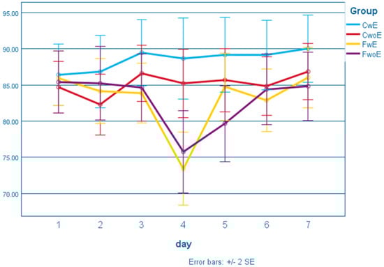 An independent sample t test was conducted to compare the initial trust level (day 1) in groups with and without the explanation. There was no significant effect of the explanation on the initial trust level, t(169) = −0.59, p = 0.56, even though both groups with the explanation (namely, CwE and FwE) (M = 86.15, SD = 10.99) exhibited higher trust scores than the groups without the explanation (CwoE and FwoE) (M = 84.99, SD = 14.32). Thus, H1 is not supported.