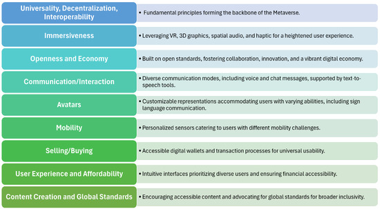The concept of the Metaverse offers tremendous potential for fostering a more inclusive and accessible digital realm. Although some initiatives have provided recommendations for enhancing the accessibility of virtual and augmented reality content [13,14], complete accessibility solutions seem to be relatively absent. Ensuring equal opportunities for individuals with disabilities in virtual environments entails addressing a variety of obstacles. One significant challenge is the lack of accessibility across numerous virtual reality (VR) platforms and applications [15]. For instance, individuals with visual disabilities may encounter difficulties navigating virtual environments that rely heavily on visual cues, underscoring the need for features such as audio descriptions or haptic feedback. Without such provisions, their ability to fully engage in digital exploration of the Metaverse is impeded. Similarly, those with mobility disabilities may face challenges in VR platforms requiring intricate physical movements or not supporting assistive devices. The use of extended reality (XR) technologies can result in sensory overload for neurodivergent individuals, and such individuals may face difficulties in accessing XR technologies due to the lack of integration of accessibility requirements in current software development practices [16]. Addressing challenges related to the Metaverse for educational purposes involves considering potential accessibility and integration difficulties for individuals with learning disabilities [6]. As the Metaverse continues to develop, it is essential to prioritize and implement inclusive design practices to accommodate the diverse needs of all users. This emphasis on inclusivity can transform the Metaverse into a space in which everyone can actively participate in virtual experiences, regardless of their abilities. Despite extensive research on VR and augmented reality (AR) for disability [17], translating these advancements into widely available market-ready products appears to be relatively infrequent.