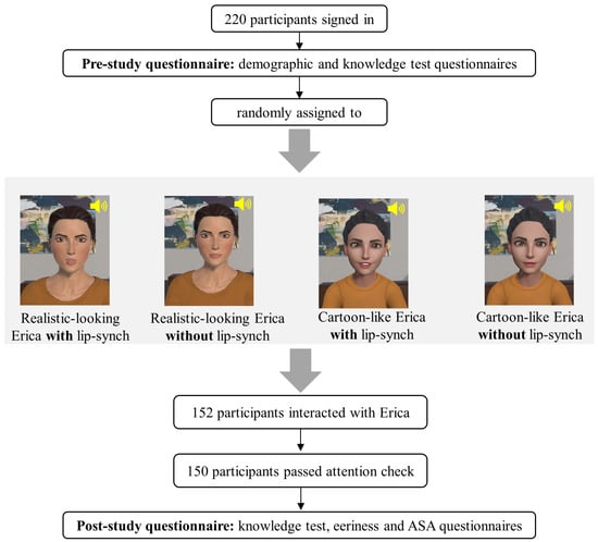 We conducted an online experiment approved by our Human Research Ethics Committee, utilising a 2 × 2 between-subjects design. The independent variables manipulated were the VA’s appearance (human-like vs. cartoon-like) and lip-syncing (with vs. without). As our key goal was to validate the types of characters we were currently using in a range of different studies which had been made with Adobe FUSE, we selected one of the FUSE characters to which we had received comments of creepiness (Adobe Fuse software is no longer possible due to its discontinuation in 2020. However, previously designed agents can be edited using the animation software Adobe Mixamo (https://www.mixamo.com/, accessed on 1 October 2023) We refer to this model as realistic, acknowledging that the model is not photo-realistic but rather has human-like features. We then used Ready Player Me (https://readyplayer.me/, accessed on 1 October 2023) to transform our original Erica into a cartoon-like Erica. The Fuse platform uses high-resolution textures and advanced shaders to create life-like skin, hair and clothing, while Ready Player Me avatars have exaggerated features (e.g., bigger eyes) and simplified textures. The study design is illustrated in Figure 1. The following sections explain the design of the study, recruitment, questionnaires utilised to test the hypotheses and the VA’s design.