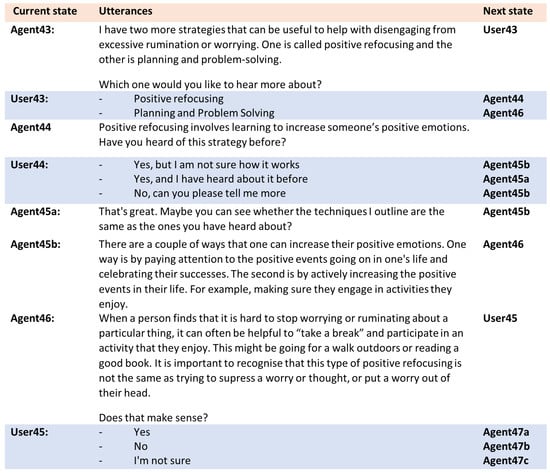 A snippet from Erica’s dialogue discussing positive refocusing based on the user’s choice. In column 1 (current state), “Agent” indicates the following text will be displayed and uttered by Erica and “User” indicates the options provided to the user. The final column (next state) manages dialogue flow indicating the next state.