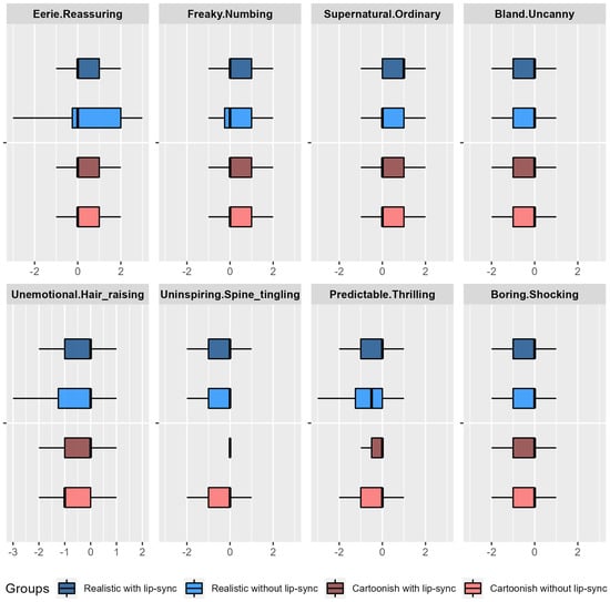 Bayesian analysis identified no significant between-group differences, including realism and lip-syncing differences on any scale of the eeriness questionnaire. Further, no interaction was identified between the look and the lip-syncing factors on the eeriness items. The eeriness scores of the four experimental groups are provided in Figure 3.