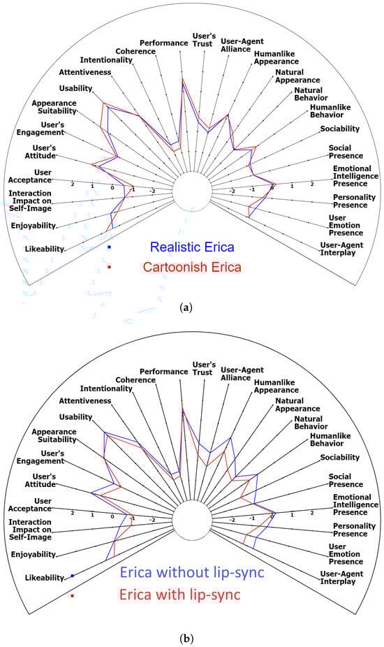 ASA comparing Erica with the different settings. (a) Realistic-looking Erica vs. cartoon-like Erica. (b) Erica with lip-sync vs. Erica without lip-sync.