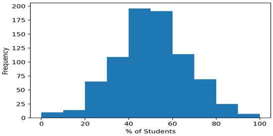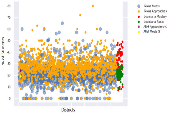 Key fields of importance extrapolated from the file include the location’s size measured by area, its geometry, and its coordinates (longitude/latitude). The states’ data were further parsed by district with these same data points. The assessment data for Texas schools comprise 1152 total districts. For the third-grade data used in this research, the percentage of students per performance category ranged from 22% to 77%, with the highest category of students attaining the approaches’ standard (minimum passing rate).