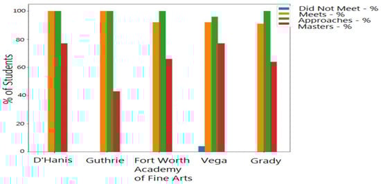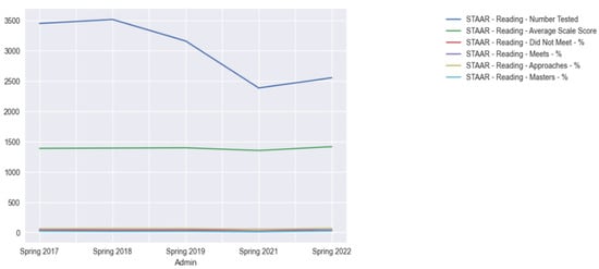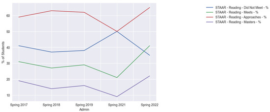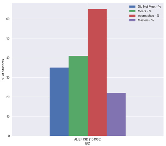 For the case of this paper’s scenario, we used the results for Alief Independent School District in Houston, Texas, as our district of interest. In Figure 15, the district’s percentage of students receiving differing designations across the district for the state assessment in reading for third grade is shown. With these types of visualizations, we can view how certain areas of interest are distributed within the organization of interest and make summative comparisons against similar organizations.