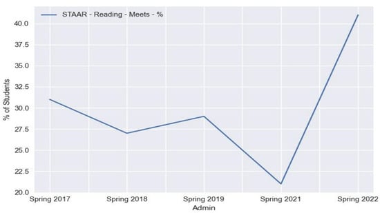 The education assessment data STAAR [21] are publicly accessible data available on the Texas Education Agency (TEA) website containing district-level data of third-grade reading performance results from assessment years 2017 to 2022. Table 1 shows the descriptive statistics of the data from Texas. Each of these datasets contains information about the district, school, class, session of the year, test type, and percentage of students meeting the proficiency level or not. These data provide an assessment of overall students within the school in the district of the state. Texas state assessment data comprise 1152 districts. Some districts lack grade-level data for specific years either because the grade level was not tested in that particular year, or the district was not actively operational during that time. These data span approximately five years of tracking and comprise a combination of numerical and textual results. Since the data are not processed, they will need to be quantified and preprocessed before being used in any of the designed models. The ingestion of collected data points included demographic data, test results, dates, and location data. The map files used for this research are in GeoJSON format and specify location-based features of the districts as well as the relative geometric shape boundary of those districts and states.