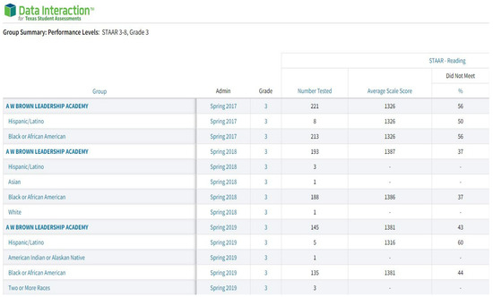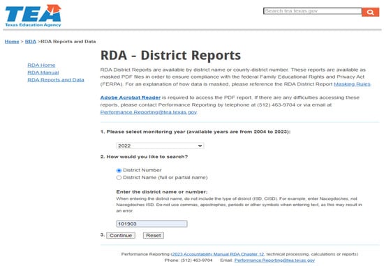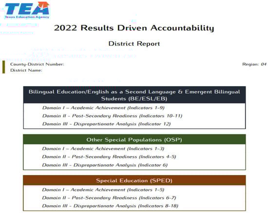 - Texas Education Agency. Results Driven Accountability Data and Reports. Available online: https://tea.texas.gov/reports-and-data/school-performance/results-driven-accountability-data-and-reports (accessed on 28 January 2024).