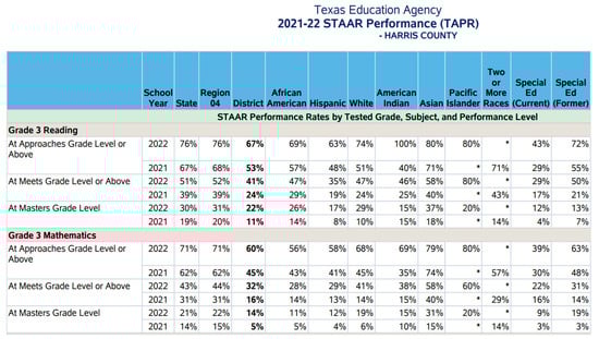 - Data Interaction for Texas Student Assessments. Group Summary: Performance Levels: STAAR 3-8, Grade 3. 2023. Available online: https://txreports.emetric.net/ (accessed on 10 December 2023).