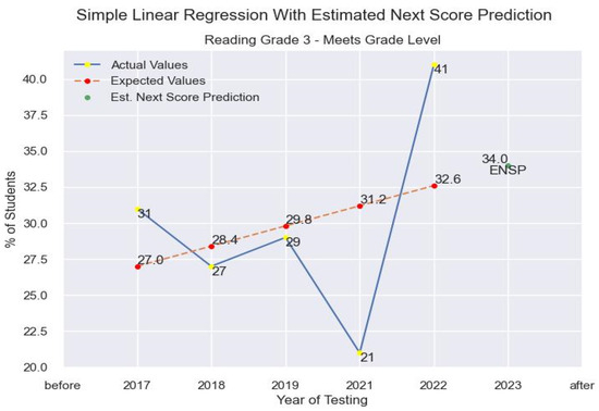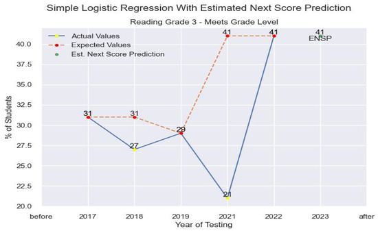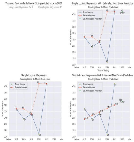 This research uses linear regression and logistic regression [27,28]. The models will take the grade-level data for the test district and use the data from the prior years to train and make a prediction for the next estimated score. Our test case uses the performance standard category “Meets grade level” and uses the percentage of students per year to make an estimate.