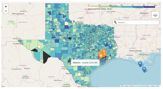 In this paper, we used GeoJSON map files and end-of-year state assessment data for the states of Texas and Louisiana, as shown in Figure 1 and Table 1. The map files we used housed the geolocations and coordinates of the districts observed within the state of Texas. These data points were used to create the district comparisons and interactive map models for our research. There was a total of three map files including the comprehensive district data file retrieved from the Texas Education Agency Public Open Data Site. The end-of-year state assessment data were obtained from publicly available sources, including the State of Texas Education Agency for students assessed in Texas, the State of Louisiana, and the National Center for Education Statistics (NCES) [21,22,23,24].