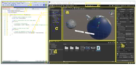 Schematic of the multi-layered AR development task for participants in Unity. (a) The “Scene View” where participants interacted with the provided 3D assets. This platform allowed participants to navigate and manipulate 3D objects. (b) The “Inspector Panel” which provides properties of the selected 3D object(s) in the scene view. Through this panel, participants were able to modify objects’ attributes like position, rotation, scale, and attach components or scripts. (c) The “Hierarchy Panel” which lists all the objects in the current scene and provides an easy way to select, organize, and manage game objects. (d) The “Project Panel” which is essentially the file browser within Unity and shows all assets, scripts, prefabs, scenes, etc. (e) The “Visual Studio” integrated IDE often used in conjunction with Unity for scripting and code editing. (f) The “Game View” where participants could preview what they built as it would appear when running. Using this participants were able to play, pause, and step through frames for testing.