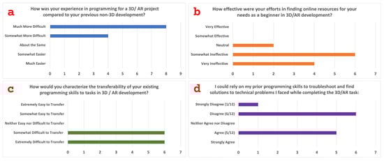 Overview of participants’ responses to post-task questionnaire. (a) Participants perceived AR development as notably challenging compared to 2D tasks, with most finding it much harder. (b) Most participants found their efforts in locating online resources for 3D/AR development ineffective. (c) Most participants found it difficult to transfer their existing programming skills to 3D/AR environments. The shift to 3D added complexities in visualizing object movements, affecting not only implementation but also problem-solving approaches. (d) Over half of the participants struggled to apply their old “test-and-develop” coding habits in the new 3D/AR environment. For example, they would choose only familiar parts of the code snippets suggested by ChatGPT, but found this strategy unhelpful for debugging intricate AR interactions involving physics forces.