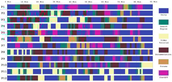 Timeline overview of participants and their information resource and development environment navigation. Participants usually began with Google searches to locate learning resources, often consulting official documentation, forums, and code snippets, with an average of 13.9 queries per session. Despite having access to the basics of Unity prior to starting the study, most participants favored learning by trial-and-error, frequently querying Unity interface specifics. On average, they switched 11 times between coding and resources, spending 44.5 min outside Unity. While initially favoring written documentation for quick lookup, 7 out of 12 participants eventually consulted ChatGPT after other resources proved unhelpful. But, only P1 and P5 found ChatGPT useful for streamlining their learning and workflow.