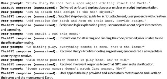 Illustration of a part of P1’s dialog with ChatGPT—one of the few examples in the study that shows successful use of AI assistance. P1 initiated the conversation by requesting C# code for a moon orbiting Earth. Faced with uncertainties in the script implementation, they followed up to clarify how to attach the script to the moon object. Subsequent questions involved adding axial rotation to Earth and the Moon, resolving issues related to object interactions and parenting. Additional troubleshooting involved resolving camera position resets and discrepancies between scene and game screens. This iterative, context-rich dialog resulted in more tailored guidance from ChatGPT, enabling P1 to successfully implement the desired orbital and rotational behaviors.