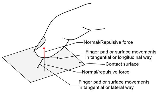 As such, we have not found related research on the comparative morphology or evolution of receptive fields on the finger pads of primates vs. humans. Since receptive fields are morphological formations [3], we can suppose that they emerged and evolved due to the optimization of afferent flow processing during continuous exploration of external objects. The exploration of objects relies on a limited number of available parsing signals or physical parameters, namely, the force applied during exploration. The exploration of the contact surface may happen when a sensitive surface of the finger pad comes into a direct contact with the external object by pushing against the contact location or when the contact surface of the object moves with respect to the finger pad. In these cases, the finger pad produces the initial force against the contact surface in the direction of the surface, thus generating repulsive force according to the surface or object physical properties (Figure 2). Exploration movements or finger pad relative displacements in the vicinity of the contact location might happen at least in two orthogonal directions (lateral and longitudinal) both tangential in respect of the applied normal force.