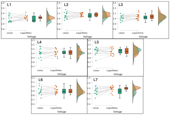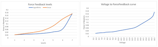 By exploring JND force perception during the pressing of a button in the range 0.5–2.5 N of the reference force, Doerrer and Werthschützky (2002) [18] revealed that on average, participants were able to perceive a sudden change in FF larger than 100 mN. However, in relation to the reference forces between 0.5 N and 2.5 N, the just-noticeable relative force differences were of 20% to 5% lower. Within the range of 1.5 N–2.5 N, the determined mean JND was lower by 7.5% and 5.5%. These results were consistent with the earlier-presented values of 5%–10% as stated by Tan et al. (1992) [19].