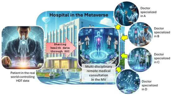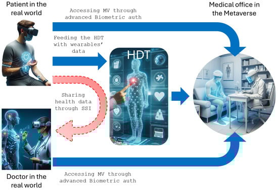 Schematic representation of the first use-case, a medical consultation in the Metaverse. The figure illustrates the seamless integration of virtual technologies and healthcare services in the Metaverse, offering users a convenient and personalized approach to remote medical consultations.