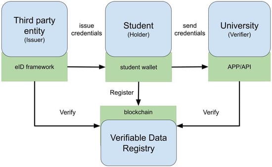 - Queiruga-Dios, A.; Pérez, J.J.B.; Encinas, L.H. Self-sovereign identity in university context. In Proceedings of the 2022 31st Conference of Open Innovations Association (FRUCT), Helsinki, Finland, 27–29 April 2022; IEEE: Piscataway Township, NJ, USA, 2022; pp. 259–264. [Google Scholar]