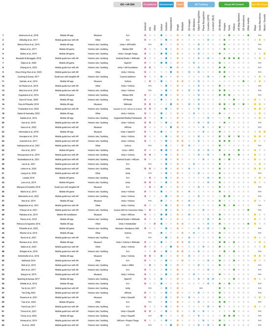 The taxonomy of the 64 reviewed papers regarding core technological and UX aspects: purpose, cultural heritage field, IDE and AR SDK, OS platform, environment, user mode, AR tracking method, visual AR content, non-AR content [4,5,6,17,18,19,20,21,22,23,24,25,26,27,28,29,30,31,32,33,34,35,36,37,38,39,40,41,42,43,44,45,46,47,48,49,50,51,52,53,54,55,56,57,58,59,60,61,62,63,64,65,66,67,68,69,70,71,72,73,74,75,76,77].