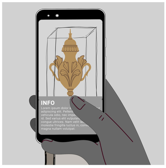 Perhaps the most essential interaction in AR involves users triggering the AR content by either scanning a target (e.g., printed material, the façade of a building, a physical exhibit, etc.) or reaching a specified location of interest. This aligns completely with the primary purpose of mobile guide applications in cultural heritage contexts, which aim to connect artifacts to informative and explanatory multimedia content [81]. In these cases, the “tricorder pattern” is implemented since the content is digitally anchored to real-world objects, shaping a blended view for users and thus facilitating a conceptual–semantic connection. AR 2D annotations, like text and images, have been extensively used in this design pattern [18,24,40,52,58,77]. When implemented in cultural exhibition settings, the “tricorder pattern” can deliver supplementary content that otherwise might be difficult to physically display, like 3D models [18,37]. Augmenting printed exhibition labels can also be a variant of this pattern [43]. Instead of superimposing text and images upon exhibit recognition, Paliokas et al. (2020) [56] implemented a side panel UI with explanatory text and images, while keeping the live camera feed unchanged. Videos can also be used with this AR pattern [63,67,74,75]. Although mostly used in smartphones, Schaper et al. (2018) [63], by following the “Window-on-the-World” interaction paradigm, utilized the “tricorder pattern” in a handheld pico-projector that superimposed videos onto the physical surroundings through projections. Lastly, Tian et al. (2023) [41] utilized 3D animations to artistically illustrate traditional Chinese poems for an AR experience in Jichang Garden, China.