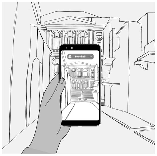 This design pattern facilitates the blending of virtually reconstructed elements and recreated events from historical eras to a variable extent with the contemporary real world (Table 4). One of the most common aspects that mobile AR applications cover to deliver views of the past involves the virtual integration of 3D reconstructions of monuments and historical buildings that have either vanished or are partially damaged into contemporary real-world settings [5,23,30,39,48,69]. Moreover, in archaeological sites, the virtual reconstruction is superimposed over the actual ancient ruins [25,51], which, in most cases, are severely damaged. Since many mobile AR apps for outdoor settings rely on GPS coordinates to register their AR content (markerless AR), and due to the actual scale of the buildings, users can physically walk around the augmented site and examine it from multiple perspectives [5,22,31,51,66,69]. An approach that achieves a similar affordance in indoor environments borrows elements from the “AR tabletop board” pattern and presents human-scale models (e.g., [43,59]. Galani and Vosinakis (2022) [35], who followed the aforementioned approach, augmented a 3D-printed small-scale model of an old factory with 3D animated human models as workers in order to demonstrate the leather tanning process. Apart from individual 3D models, other means of projecting an entire recreated historical scene via AR in outdoor settings could include 360-degree photospheres embedded with 3D models [57] and 2D images using a combination of a fading effect and perspective transformation to seamlessly blend them with the real world [27,33]. Furthermore, significant enhancements in this AR pattern could include introducing animated digital characters [78] or enabling users to actively participate in scene recreation. Concerning the former, Liestøl (2018) [48] supplemented the virtual reconstruction of a historic square, which consisted of several 3D buildings, with animated digital humans and vehicles aligned with the depicted period. Since the primary focus of this AR design pattern is to present AR content, the users tend to act as viewers, and, consequently, this might result in limited provided interactions. Tan and Ng (2022) [71] have introduced an interactive AR activity in their mobile game that asks users to virtually place white candles in their surroundings, while keeping a distance between them, in order to simulate a ritual for the festivals of the Kristang community.