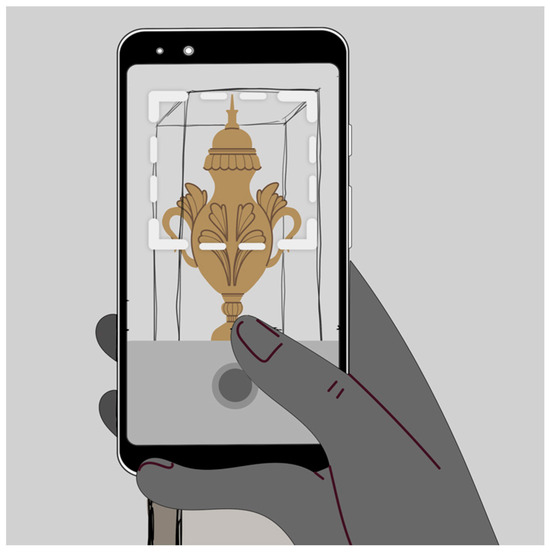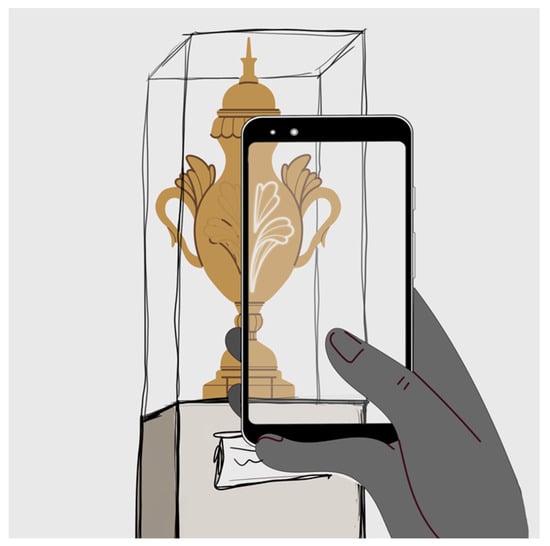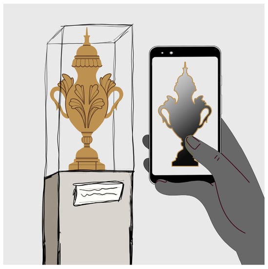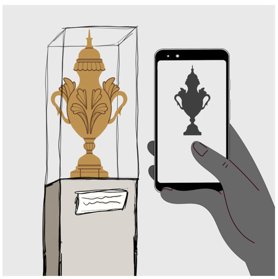 This AR design pattern could be described as the visual equivalent of the “information gap” technique, which involves purposefully withholding pieces of information in order to stimulate curiosity [84]. It seeks to conceal or selectively present visual elements of an image or environment to provide visitors with navigational guidance in an engaging and gamified way [81] (Table 11). An example of concealing aspects of the real world is the presentation of the outlined shape of an object, while making the interior details obscure or empty (as illustrated in Figure 6). In [53], visitors are challenged to match the silhouettes presented in the mobile app with the appropriate embalmed animals exhibited in the Natural History Museum. Similarly, in [43], the silhouettes of real objects that act as AR markers, such as signboards and wall panels, aid users’ self-navigation. Furthermore, this pattern could also assist visitors in orienting their sight towards defined areas within a location. Damala et al. (2016) [28] used exhibit outlines in their tangible AR Loupe to focus the gaze on museum displays, while outlines of buildings were utilized in an outdoor setting in [4]. In the latter work, the outlined images were seamlessly intertwined with storytelling as the abstract representations of reality symbolized the faded memories of the spirit-like main character [4].