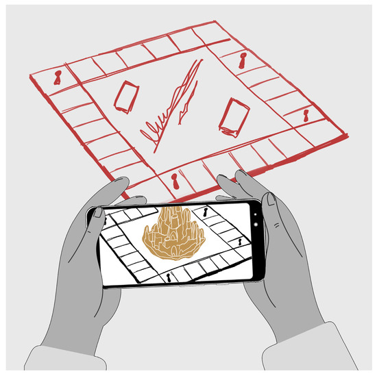 Apart from small-scale physical artifacts, the internal structure revelation pattern can also illustrate the construction processes or interior layouts of historical buildings. Plecher et al. (2019) [59] implemented marker-based AR in their educational AR game to overlay 3D models of Celtic buildings onto printed markers, which also functioned as board game components. When the player moves their device closer to the virtual model, the roof fades out and the interior of the house is revealed. Koo et al. (2019) [43] have incorporated simulation construction AR games into their mobile guide application that allows users to virtually construct, step by step, historical buildings located inside the Hwaseong Fortress, South Korea. A similar, but technically simpler, approach to exploring indoor spaces was followed in [45]: after the superimposition of the 3D model of a stone pagoda temple over a QR code marker, users can navigate inside its virtual space (in a non-AR way) and play treasure-hunt-like games. Based on the mentioned works, the revelation effect can be categorized either as passive (e.g., merely scanning the AR marker) or as active, in which case users can perform more engaging interactions.