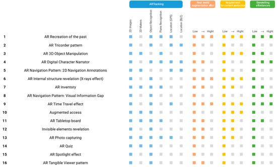 Over the last few years, several examples of UX design patterns have been applied in mobile CH applications, including virtual characters that provide narrations about CH (e.g., [4]), the appearance of 3D models of various interaction affordances to augment the user’s view of an environment (e.g., [5]), overlays of 2D texts or signs to assist user navigation (e.g., [6]), etc. However, there is no systematic identification, recording, or analysis of these patterns for the designers of mobile AR user experience for CH, with the consequence that the use of AR in CH is often ambiguous or limited to the mere superimposition of 3D models, without further meaningful interactions. A few previous reviews of mobile AR in CH approach the issue of UX design patterns indirectly but do not provide an in-depth analysis. For example, according to Goh, Sunar, and Ismail (2019) [7], all AR interaction techniques fall into one of three categories: touch-based, mid-air gesture-based, and device-based interaction techniques. Touch-based interactions involve users tapping the touchscreen with their fingertips, and mid-air gesture-based ones recognize not only fingers, but user’s whole hand as input. Device-based interactions are derived from rotate, tilt, and skew transformations and the movement of the mobile device itself. Other surveys review software frameworks or design processes for AR applications in CH and present discussions of UX patterns between the lines (for example [8,9,10,11]). Some surveys focus on technological advances in the fundamental elements of mobile AR, such as tracking and registration, network connectivity, software frameworks, AR-enabled devices, and system performance [12]. Finally, a few surveys assess mobile AR from neighboring fields to CH, like history learning or education, with a focus on the learning effects for students or learners [13,14,15].
