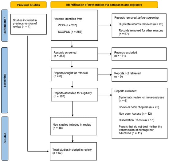 Following the introduction of the search strategy, the initial number of documents identified was 463. However, upon selecting the “articles only” option, this number was reduced to 187. Once all the articles had been obtained, the inclusion and exclusion criteria were applied, and the articles were discarded based on their titles and abstracts. This process resulted in a total of 48 documents. Similarly, based on other similar works [56], it was deemed beneficial to incorporate four additional articles from the initial search that had not been identified in the subsequent search, resulting in a final total of 52 articles.