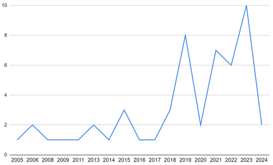 It is important to note that the year 2024 cannot be considered in the same manner as the other years, as only five months have elapsed since it began and only two articles related to this topic have been published (3.85% of the documents analyzed).