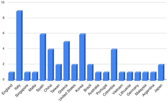 Upon analysis of the documents according to the country of publication, it is revealed that Italy is the country with the highest number of articles published on the topic of this literature review, accounting for 17.31% of the total number of documents. Republic of Korea and Spain follow with 11.54% each (Figure 4).