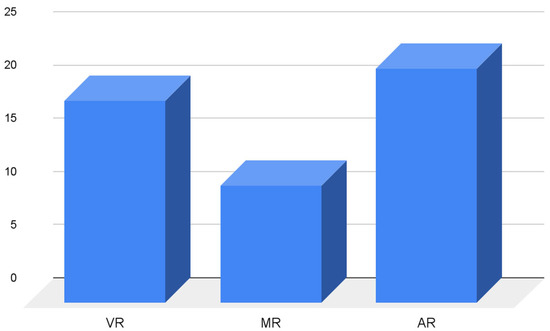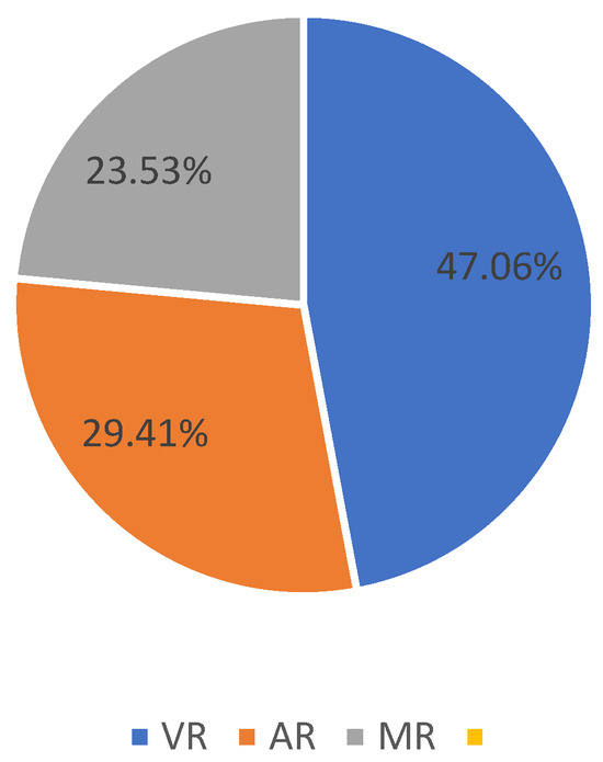 As illustrated in Figure 6, the most prevalent technology utilized is augmented reality (AR), with 42.31% of the analyzed articles incorporating AR into their design or implementation. This is comparable to the prevalence of virtual reality (VR), which was employed in 36.54% of the articles.