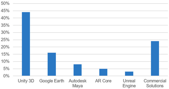 Regarding the tools utilized for experience design, it is noteworthy that 14 of the analyzed documents, representing 26.92% of the total, lack any information pertaining to this aspect or have employed previously developed experiences. In contrast, the remaining 38 documents indicate that Unity3D was the most utilized software, selected in 44.74% of cases. This software was employed in conjunction with Vuforia on four occasions, as well as Blender, Substance Painter, and 3Ds Max in other cases. Unity3D was primarily utilized for virtual reality (VR) applications (47.06%), followed by augmented reality (AR) applications (29.41%) and real-time modeling (RM) applications (23.53%), as illustrated in the graph in Figure 7. Google Earth, which was used in 15.79% of the analyzed documents, was the next most prevalent software, all for AR applications. The Autodesk Maya software is utilized in 7.89% of the cases, with an equal distribution among the three technologies. The AR Core software is used in 5.26% of the cases. Only one case of the use of Unreal Engine (2.63%) was found, this time focused on VR. The remainder of the documents analyzed employ a variety of solutions and commercial proposals, as shown in Figure 8.