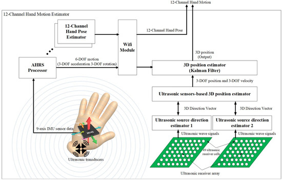 The proposed device tracks hand positions in 3D space using a combination of ultrasound-based position estimation, inertial sensor-based 3D acceleration, and pose estimation. However, there are well-known problems for these sensors: ultrasound-based devices have high computational costs, IMU sensors are sensitive to drifting issues, and it is difficult to estimate 3D positions continuously without noise. Considering these, we combined two different types of sensors into the proposed device, which consisted of four ultrasonic source generators, two ultrasonic receiver arrays, two 3D ultrasonic source direction estimators, an ultrasonic sensor-based 3D position estimator, a 9-axis IMU sensor, an attitude and heading reference system (AHRS) processor, and a 3D position estimator, as shown in Figure 1.