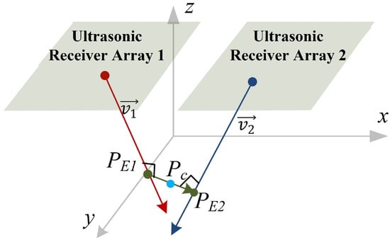 The closest point, , to the intersections, and , of the two ultrasonic direction vectors, and , which are obtained from the source localization methods [32], is estimated as the 3D location of the ultrasonic waves.