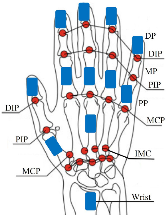 The placements of the IMU sensors (blue) on a hand: the distal phalange (DP) bones, the distal interphalangeal (DIP) joints, the medial phalange (MP) bones, the proximal interphalangeal (PIP) joints, the proximal phalange (PP) bones, the metacarpophalangeal (MCP) joints, and the intermetacarpal (IMC) joints.