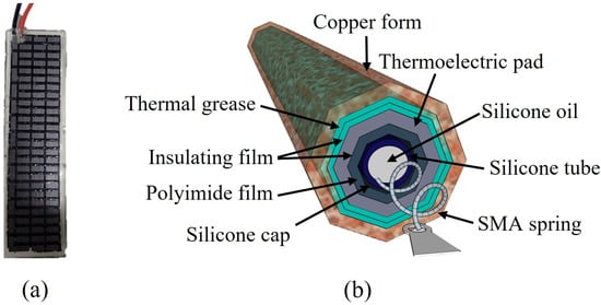 SMA cooling: (a) the thermoelectric pad with a size of 25 × 80 mm and (b) overall cooling structure.