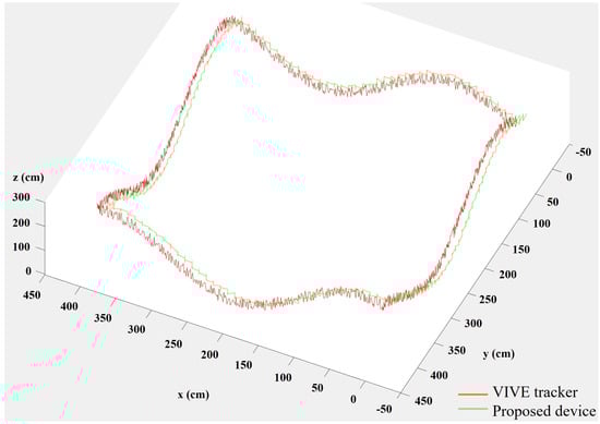 Figure 9 compares the performance of tracking hand positions between the proposed device and the VIVE tracker [23]. Both devices were tracked approximately 30 m in an indoor room with dimensions of 4 m × 6 m × 2.5 m (width × length × height). The total distance offset of the proposed device compared to the tracker was less than 5 cm without a drift. Furthermore, Table 1 compares the finger rotations in various hand poses between the proposed device and the commercial glove [17] using the marker-based motion capture system [44]. In this comparison, a total of 1000 joint rotations were collected at 120 Hz from the hand poses. As shown in the table, the angular differences of the MCP, PIP, and DIP joints for the proposed device were less than the ones for the commercial one (i.e., 0.51–1.24° against 2.27–2.82°, 1.46–2.60° against 2.07–2.78°, and 0.95–2.69° against 2.3–3.44°). An interpolation estimation was used in the proposed device for the PIP joints. For the third and fourth poses in Table 1, the commercial device showed larger differences as this device relies on flexible sensors to estimate finger rotations, which is not as precise as the proposed device using multiple inertial sensors.